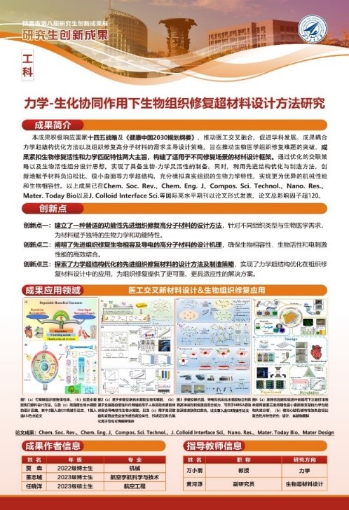 2022级博士研究生贾犇负责的“力学-生化协同作用下生物组织修复超材料设计方法研究”(指导教师:万小朋、黄河源)获得省级A类奖项(全校仅六项,全省57项)。本次获奖是学院学子首次参与陕西省研究生创新高质量成果展并取得的新突破!