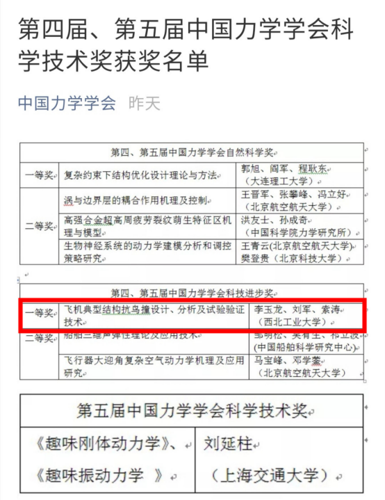 李玉龙、刘军、索涛三位教授的“飞机典型结构抗鸟撞设计、分析及试验验证技术”项目荣获第四届、第五届中国力学学会科技进步奖一等奖。