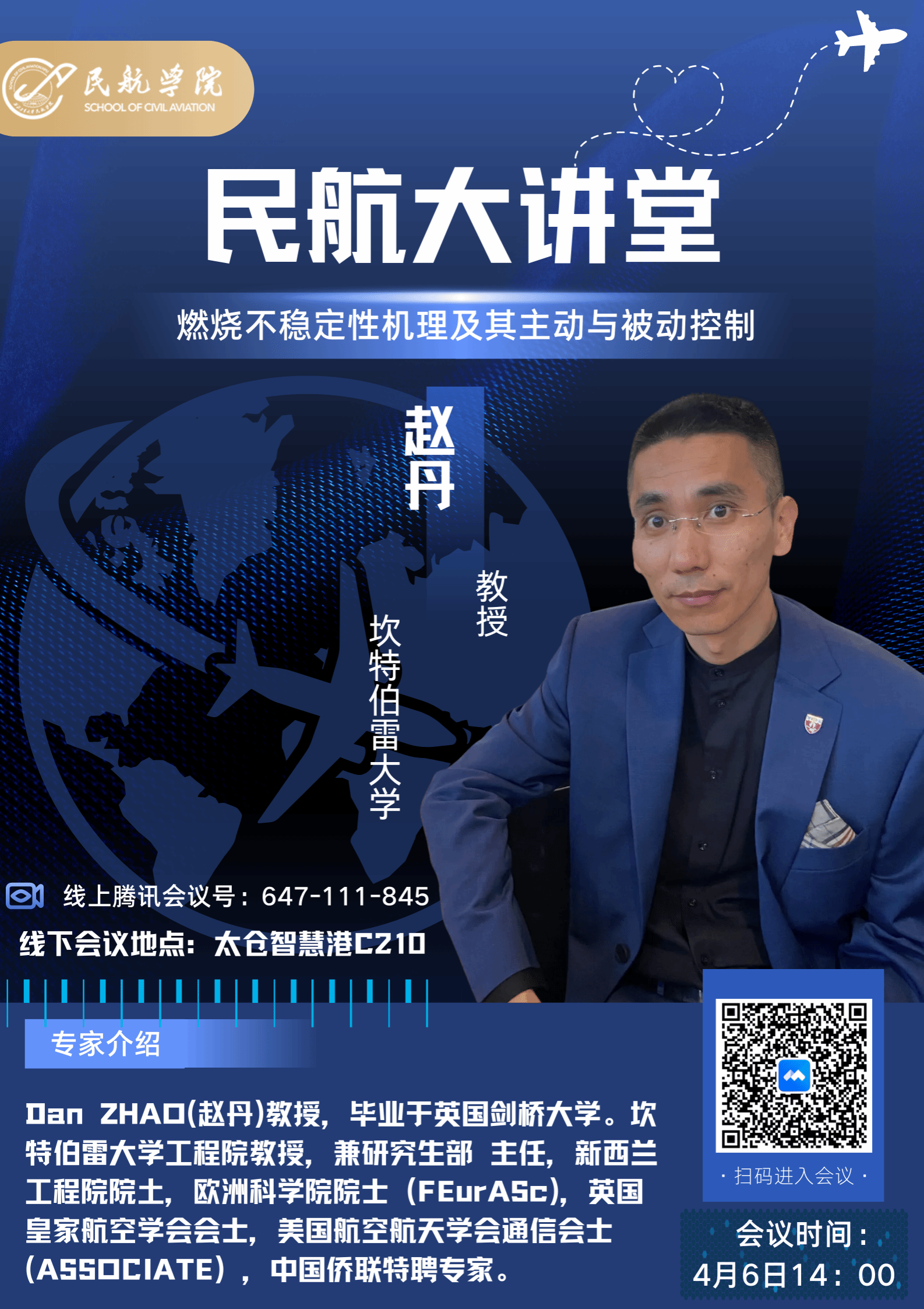 Dan ZHAO(赵丹)教授,毕业于英国剑桥大学。坎特伯雷大学工程院教授,兼研究生部主任,新西兰工程院院土,欧洲科学院院士 (FEurASc),英国皇家航空学会会士,美国航空航天学会通信会士(ASSOCIATE),中国侨联特聘专家。