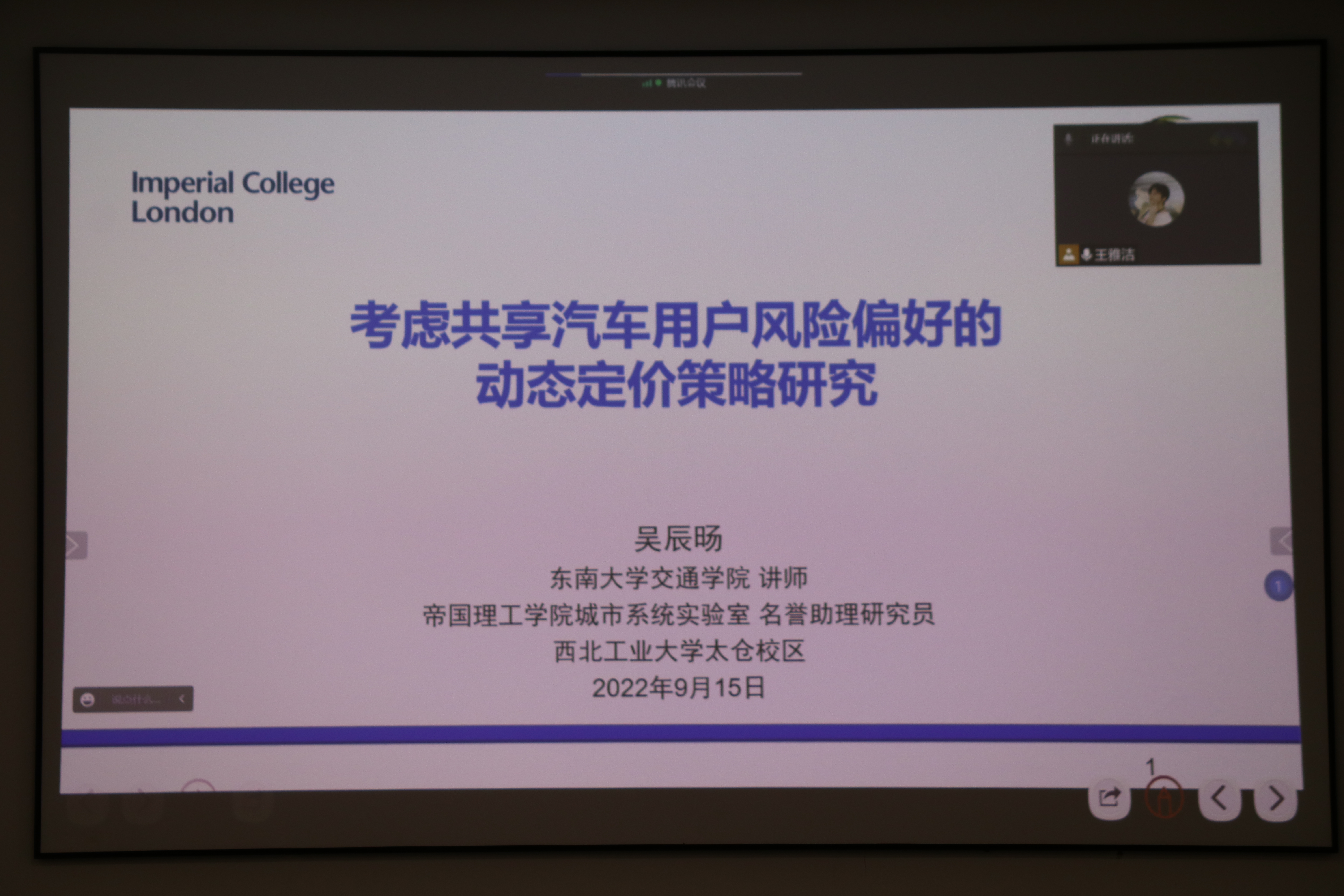 邀请,东南大学交通学院讲师、帝国理工学院博士吴辰旸在太仓智汇港C210会议室作了题为“考虑共享汽车用户风险偏好的动态定价策略研究”的学术报告。此次报告采取线上、线下相结合的方式进行,由学院副教授孟岭超主持。学院院长李玉龙、党总支副书记(主持工作)闫伟,以及其他青年教师和研究生参与了交流。