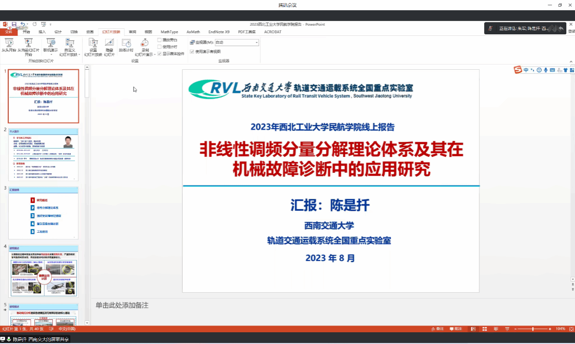 师生开展主题为“非线性调频分量分解理论及其在故障诊断中的应用研究”的线上研讨会,学院余亮老师和外校师生合计超过40多人参加了此次研讨会,研讨会由朱军主持。