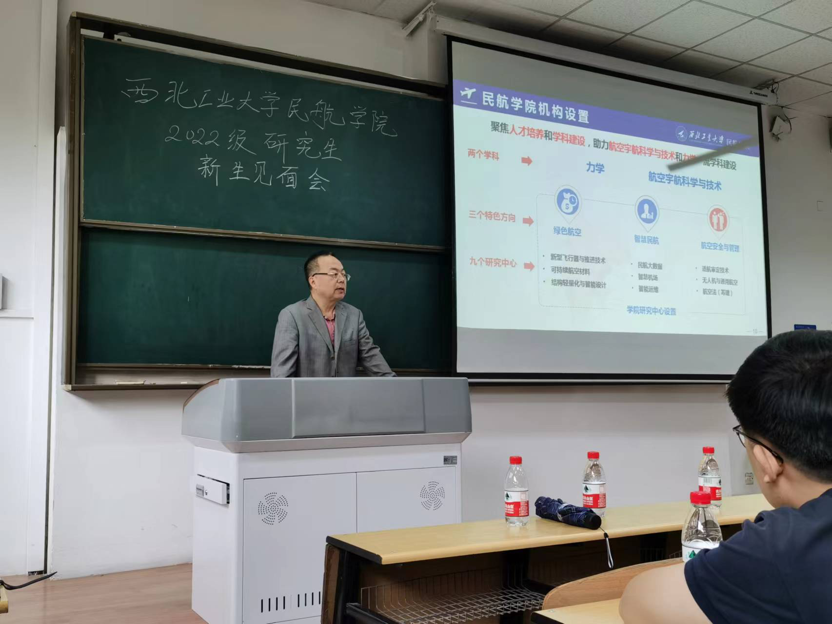 会议开始,党总支副书记(主持工作)闫伟代表学院向2022级研究生新生表示热烈欢迎,并以“不负韶华 勇于追梦”为主题,为全体新生讲授了研究生生涯的第一堂思政课。他向同学们讲述了西工大“脉源三支,强强融合”的历史沿革,带领同学们学习校史,并结合校训、校风和当代民航精神等,向同学们提出了“努力成为堪当民族复兴重任的时代新人”的希望。