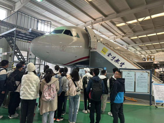 抵达目的地后,同学们立即分成三组开始沉浸式研学:一组进行空客A320绕机检查实训,一组开展塞斯纳、西锐等通航飞机的参观和体验,一组进行机上紧急撤离模拟演练。得益于工作人员的生动解说,大家对民航、通航飞行器有了更加清晰的认知,对航空发动机的主要部件和工作原理有了进一步的了解。
