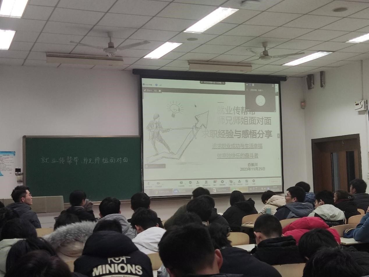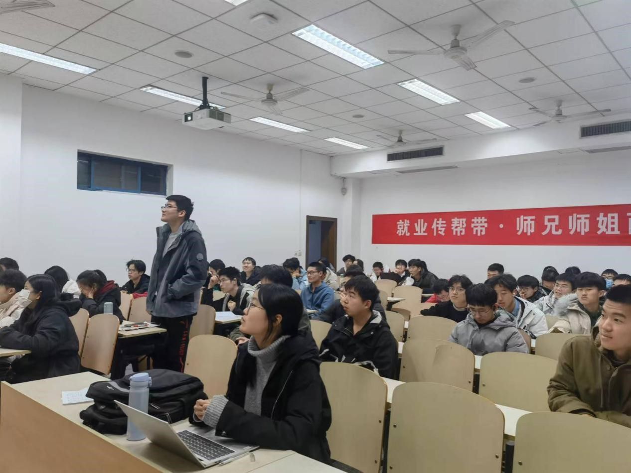 的2023届硕士研究生白振川聚焦“追求职业成功与生活幸福”,进行求职经验与感悟分享。白振川分享了实现职业生涯规划的方法,强调态度、对专业的了解、个人的精神需求等方面的重要性,以及在职业选择和职场选择时的考量因素及其重要性。最后,他还分享了有关于研究生期间的经验以及大学生职业规划与发展的问题,以及对职场竞争和个人选择的策略,解答了同学们的疑问。