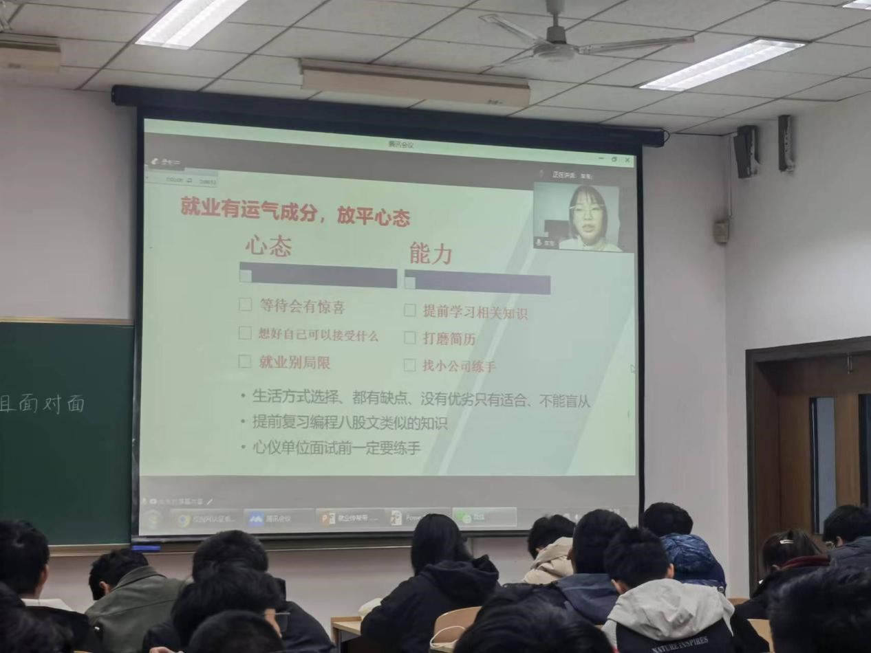 2023届硕士研究生车芸向同学们分享了关于求职的经验方法。她强调了寻找工作时的心态和能力提升,并提出了三个就业相关的建议,以及求职过程中个人心态、面试态度、个人事务处理等方面的求职细节与策略。此外,她还提到了大学生当前的就业形势情况,建议同学们关注国际形势,更好地应对未来挑战。