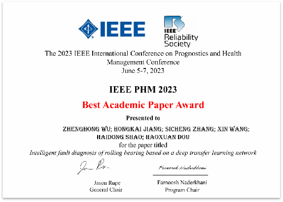 2021级博士生吴正红做题为“Intelligent fault diagnosis of rolling bearing based on a deep transfer learning network”的口头报告并获最佳学术论文奖。