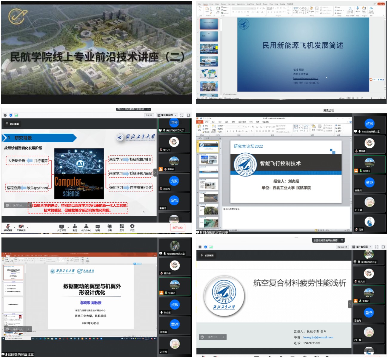 首先,崔浩教授以“民用新能源飞机发展简述”为主题进行了报告,绿色低碳环保是可持续发展的主流诉求,随着新材料以及新技术的不断涌现,民用航空工业也即将迎来技术革命的浪潮。概述未来新能源民用飞机的发展趋势,讨论其关键技术与挑战,并针对近年来的复合材料轻量化结构以及电动化发展趋势进行展开介绍。接着,姜洪开教授针对飞机健康信息深度融合与智能预示,介绍研究团队开展基于深度学习的智能运维技术方面的研究成果。通过建立飞机健康状态多源深度信息融合方法,挖掘飞机不同源数据之间的关联性特征信息和深层特征知识;建立基于飞机健康状态多源深度信息融合特征的深度强化智能预示模型,识别和预测飞机健康状态。刘贞报教授为同学们带来了题为“飞机智能飞行控制技术”的讲座,飞行控制系统是飞机的大脑,控制着飞机的起飞降落与巡航,关乎飞机的飞行安全和飞行性能。飞行控制系统的智能化大大提升飞机自主飞行能力,包括飞机主动控制、自主起降、自动巡航、密集编队、智能避障、故障容错控制、抗风扰控制等技术,涉及飞行控制系统底层硬件研制、飞机动力学模型、飞行控制系统算法仿真、飞行控制系统软件研制、模拟飞行试验、实地飞行试验等研究工作。“基于数据驱动建模的翼型与机翼外形设计优化”及“航空碳纤维复合材料疲劳性能浅析”由邬晓敬副教授和黄甲副教授分别主讲,两位老师均带来了内容十分丰富而精彩的讲座。