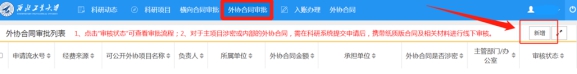 科研系统,选择“外协合同审批”功能模块,点击新增,根据系统提示办理业务。